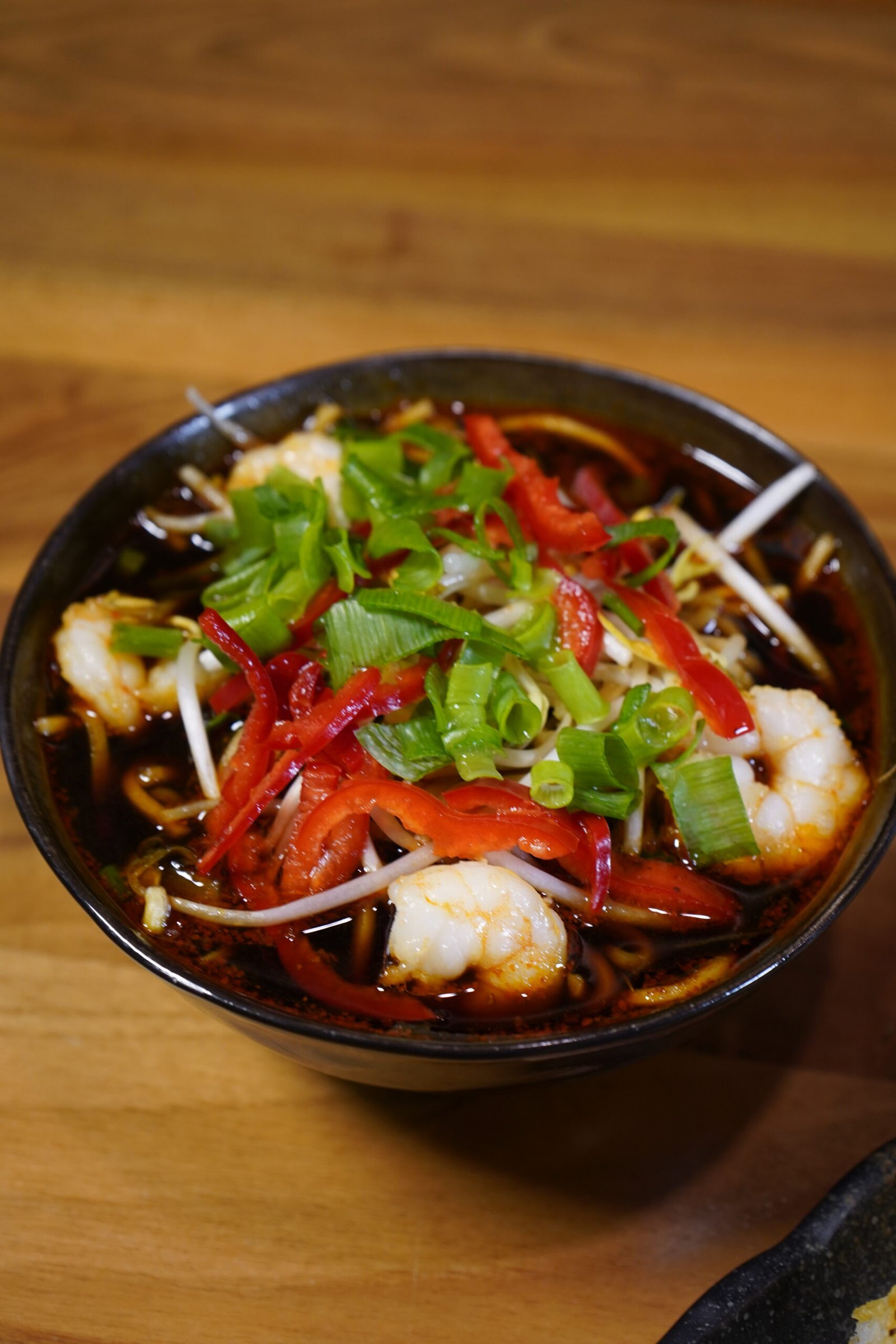 Noodle, Karides, Mantar, Soya filizi, Soğan, Biber, Acı sos