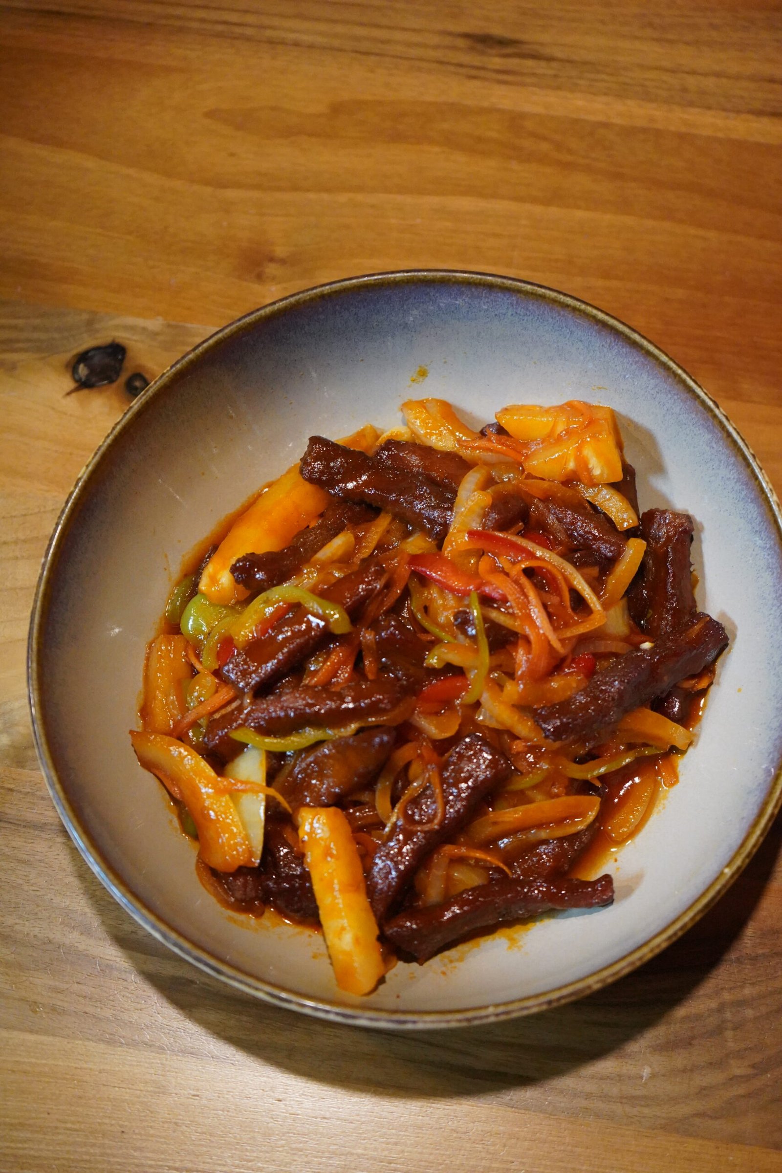 İnce et, Tatlı ekşi sos, Soğan, Biber, Havuç, Ananas