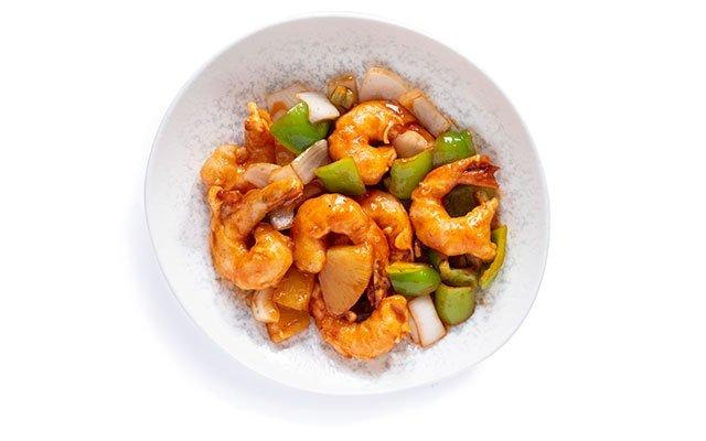 karides,dolma biber,kapya biber,havu.kuru soğan,ananas,tatlı ekşi sos ile